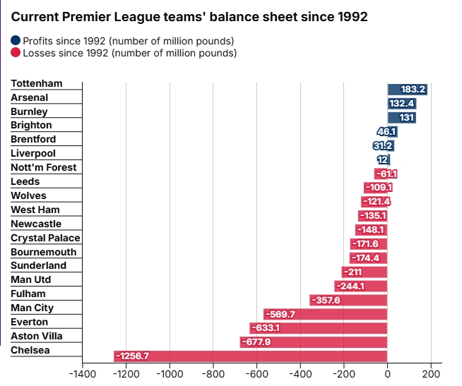 英超时代盈亏榜:热刺、阿森纳盈利前二,切尔西亏损超12亿镑垫底